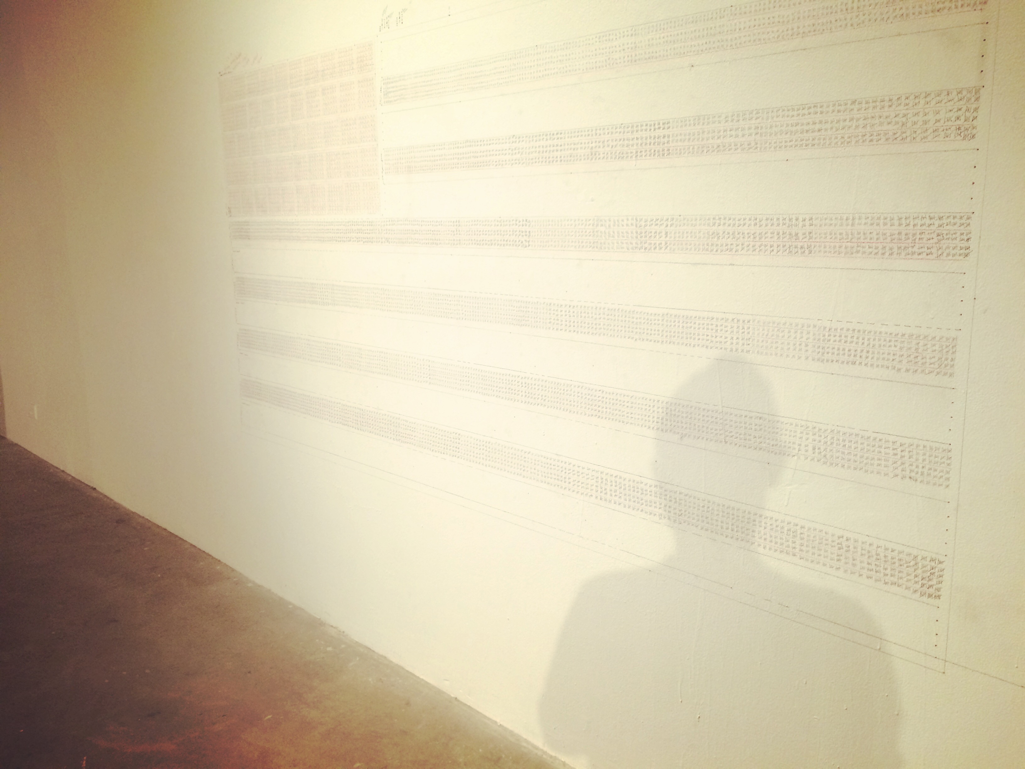 Such planning surely takes time, and thus becomes a different kind of work, one that likely occurs after hours, and forfeits rest for “planning.” Mr. Proud, why do I have to memorize the Star Spangled Banner? is a durational piece by Nuttaphol Ma, in which he clocked in with his personal time clock for eight-hour graveyard shifts, to fill neatly delineated grids on the wall with the Chinese character zhèng, meaning ‘correct,’or ‘upright.’ Each section is outlined with thread that is delicately wrapped around burnt incense stubs protruding from the wall, completing at a distance the U.S. flag. The characters, repeated over and over, are all slightly different; sometimes they are assertive and other times they trail off, faithful to the state of the writer, who has etched his presence through attendance, with diligence and fatigue. Ma’s use of the zhèng character refers to the uprightness of the wall, which Ma is called upon to match—as in Ma has to be upright to write on the wall. Ma must then hold a position reminiscent of a disciplinary imperative, that of standing in a corner, or facing a wall. Interestingly, while Ma carries out the self-imposed punitive action of writing lines, he faces or stands up to the uprightness and correctional rigidity of institutional walls. In his book Defacement, Michael Taussig writes “The shortest way between two points, between violence and its analysis, is the long way round, tracing the edge sideways like the crab scuttling. This we also call the labor of the negative.” Instead of burning, shredding, or destroying the flag, Ma constructs one that more accurately reflects its relationship, as he sees it, to the body of a laboring nation. If the labor of inscription constitutes the body of the flag, what becomes of the body of the laborer, who after toiling through night shifts, I imagine returns, further exhausted, to some other job?