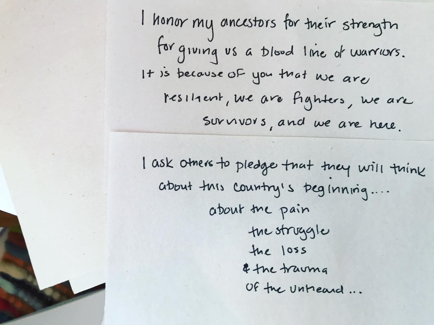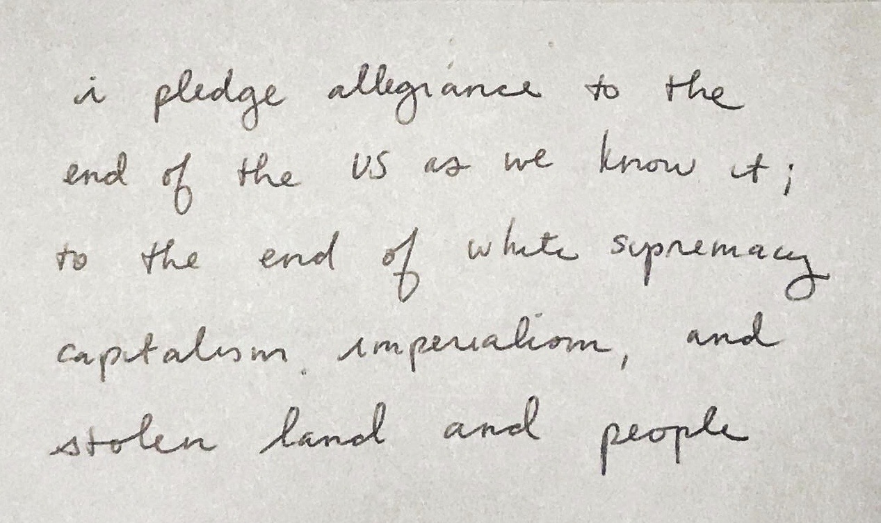 Concurrently, I've created a participatory workshop aimed to reflect on how the pledge came to be, to consider the words in detail. The collective performance aspires to unpack these points through a series of facilitated writing and reflection exercises sequenced to guide participants to imagine what their pledge will be to achieve a sense of home for all. I will collect these reconsidered pledges, care for them. With time, I shall carry these words and recite them all at the reflecting pool of the Lincoln Memorial, the base of the Statue of Liberty, and along the shores of Angel Island. During the pandemic, I also created a participatory sculpture that invited folks to pin their reconsidered pledges onto the object.